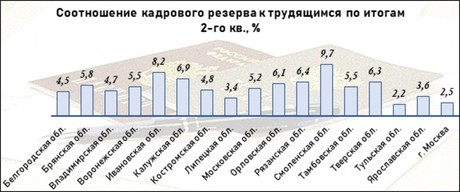 Соотношение количества нетрудоустроенных граждан с числом занятых в экономике жителей равно 4,2%. Во втором квартале прошлого года этот показатель был на 0,6 п.п. больше. Наивысшее соотношение двух групп отмечается в Смоленской и Ивановской областях. В двух упомянутых регионах на 10 работающих приходится один незанятый житель, желающий трудиться и приносить пользу. Минимальное соотношение кадрового резерва к рабочему слою населения фиксируется в Тульской области и столице – менее 3 п.п.