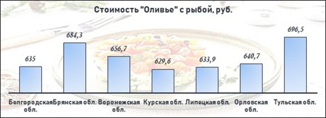 В Белгородской и Липецкой областях новогодний салат с рыбой прибавил в стоимости более 10%, в Орловской области – в районе 10%, в Воронежской и Тульской областях – около 5%. В Курской и Брянской областях стоимость данного вида "Оливье" даже немного опустилась – на 1,1 и 3,2 процента соответственно.