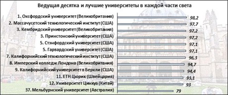 Первым вузом в рейтинге не из США или Великобритании оказалась Швейцарская высшая техническая школа Цюриха. Самым престижным учебным заведением Азии признан Университет Цинхуа, Австралии и Океании – Мельбурнский университет. Китайский университет отличился высокими показателями в сфере обучения бизнесу и экономике. К тому же, ему добавляет авторитета тот факт, что два последних председателя КНР значатся среди выпускников этого вуза. Австралийский университет дает высокий уровень знаний в области права, медицины и здравоохранении.