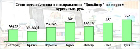 Годовая стоимость обучения на первом курсе варьируется от 140 до 294 тыс. руб. (данные за 2025/26 учебный год). Меньше всего освоение профессии дизайнера стоит в Белгородском государственном институте искусств и культуры – 70 тыс. руб. (цена за 2026/2027 учебный год). Очно-заочная форма обучения дешевле примерно в два раза.
