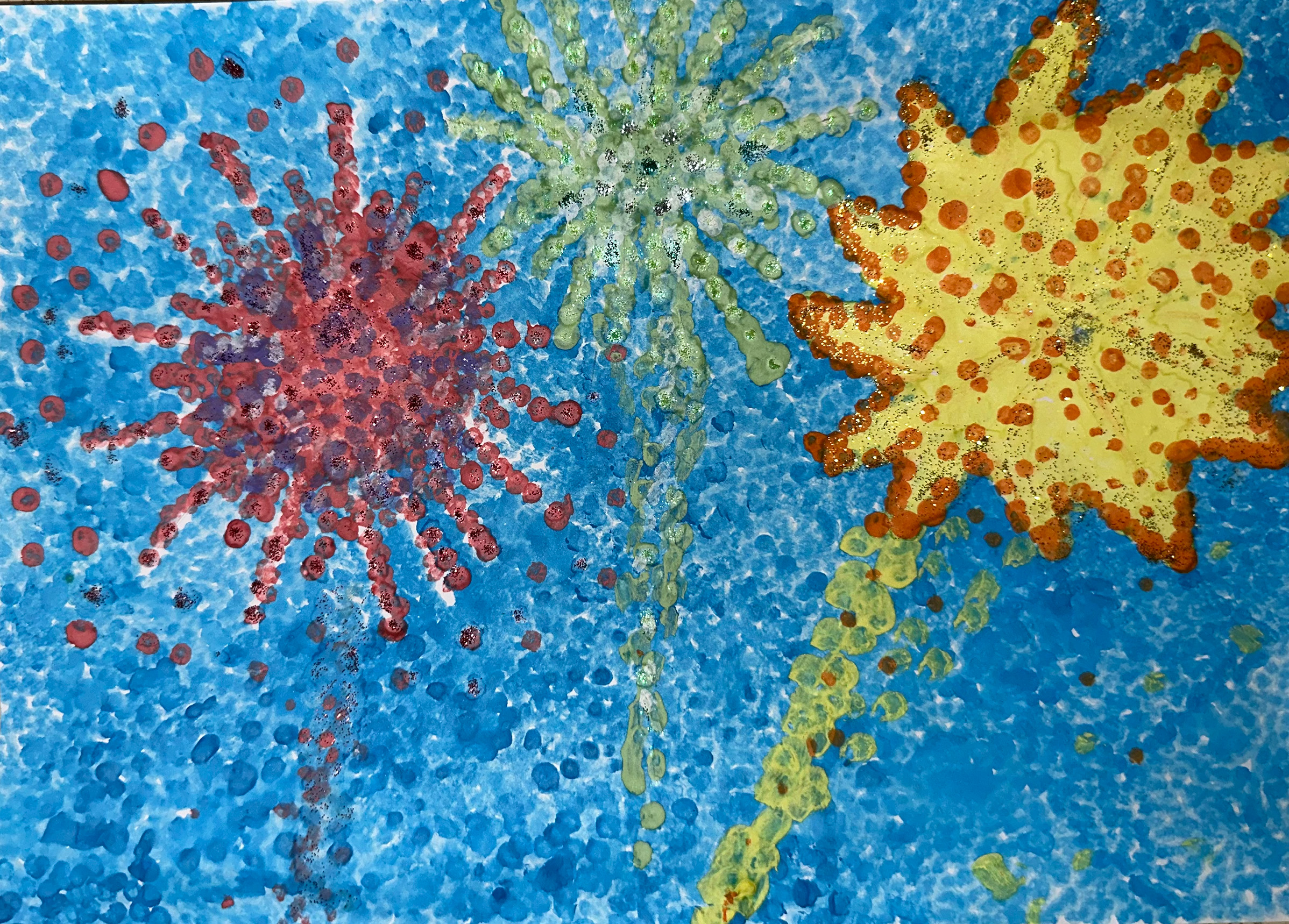 Описание: Мне всего 3 года, поэтому салют изображен таким, каким я себе его представляю. На рисунке изображен салют, который символизирует Победу русского народу над фашизмом. Именно красочные огни в небе запоминаются детям больше всего и становятся первой ниточкой формирования героического облика русского народа у подрастающего поколения.