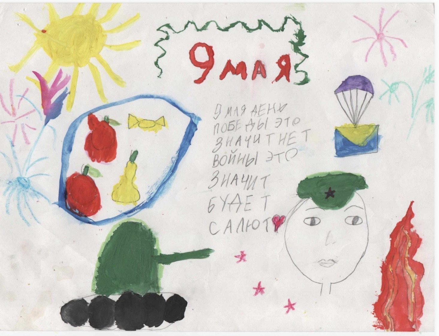 Описание: Рисунок передаёт атмосферу радости, мира и благодарности за победу, сочетая военные и мирные символы. Автор подчёркивает, что День Победы — это не только память о прошлом, но и праздник мира, счастья и надежды на будущее.