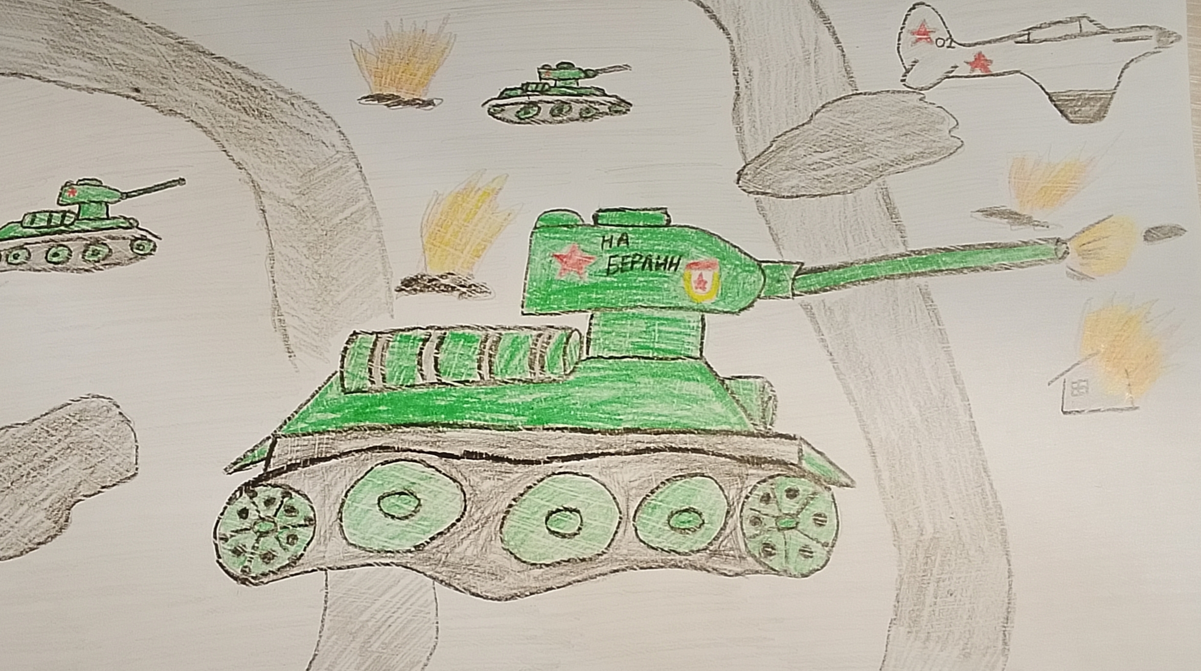 Описание: Пестова Дарина д/с 150 Войска красной армии стремительно идут в наступление подавляя силы противника с помощью легендарных танков Т-34 и с авиацией!