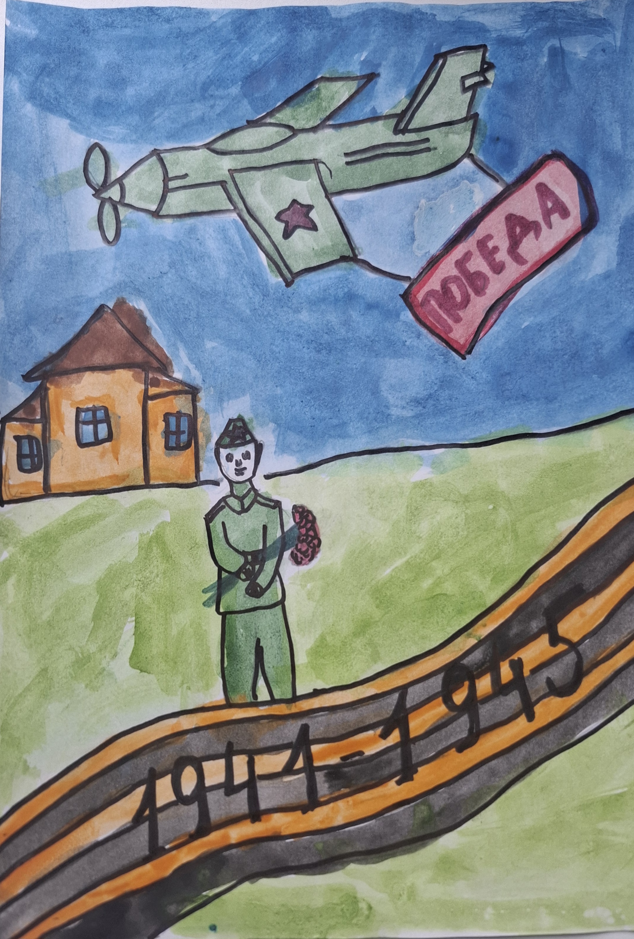 Описание: Самолет победы пролетает над солдатом, с гвоздиками в руках