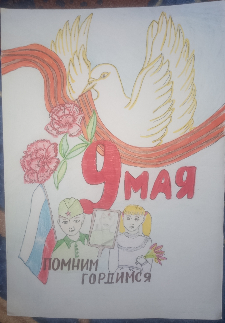 Описание: Голубь мира, мальчик и девочка держат фото своего дедушки