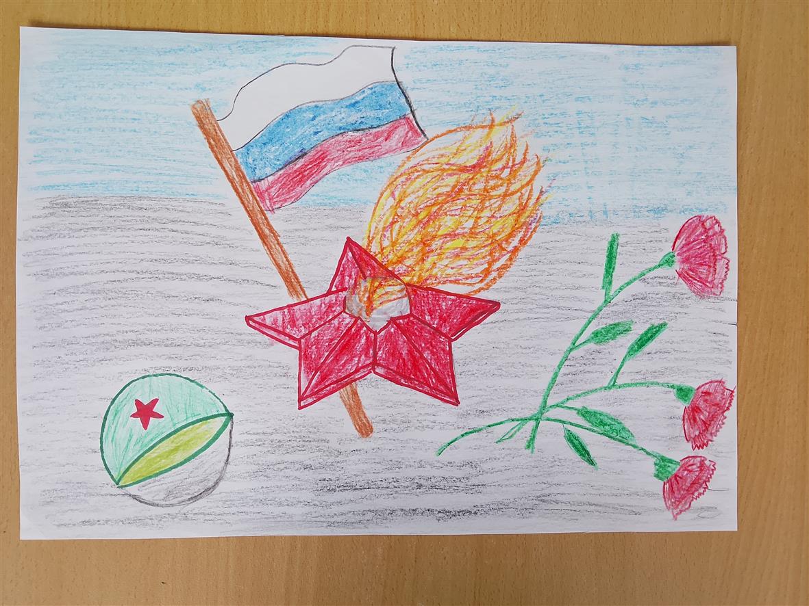 Описание: Рисунок, посвященный Дню Победы: Вечный огонь, триколор и гвоздики - символы памяти и уважения к героям войны.