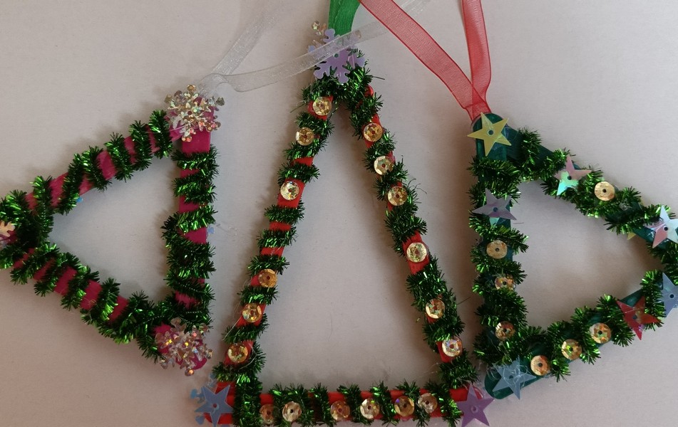 Описание: Каркас елочек сделан из палочек для мороженого, украшены мишурой и пайетками. МБУДО "Детский спортивно-образовательный центр"