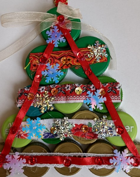 Описание: "Экоёлочка" сделана из пластиковых крышечек, украшена тесьмой и пайетками. МБУДО "Детский спортивно-образовательный центр".