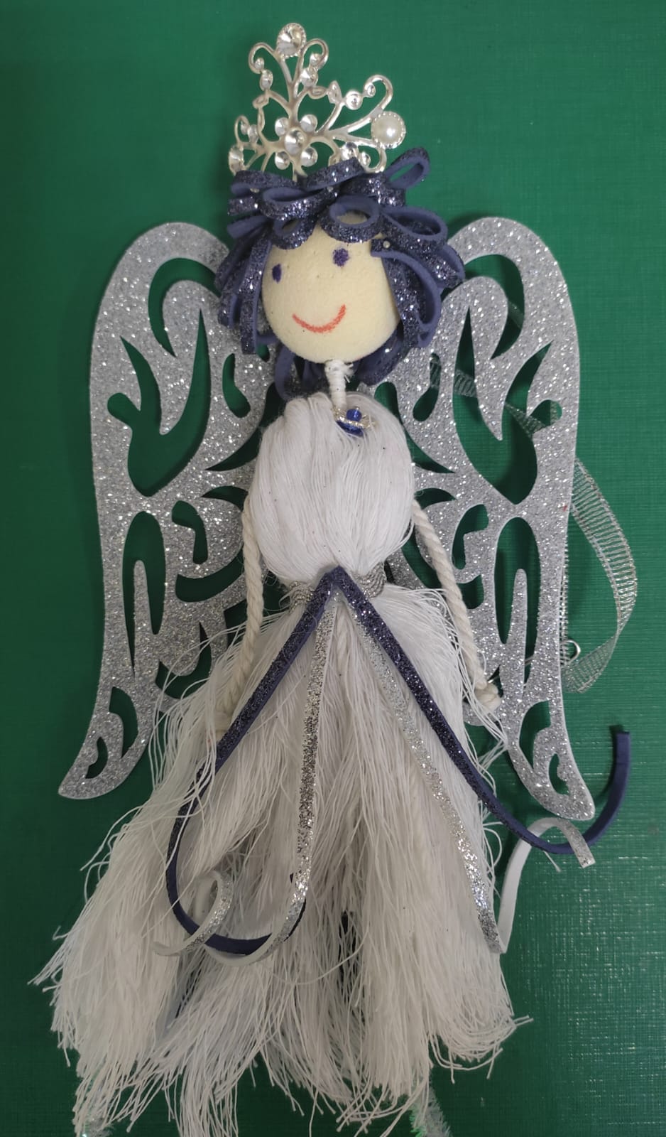 Описание: Прекрасный ангелочек сделан из мягкого шарика, ниток,шпагата,блестящей бумаги и бус с лентой.