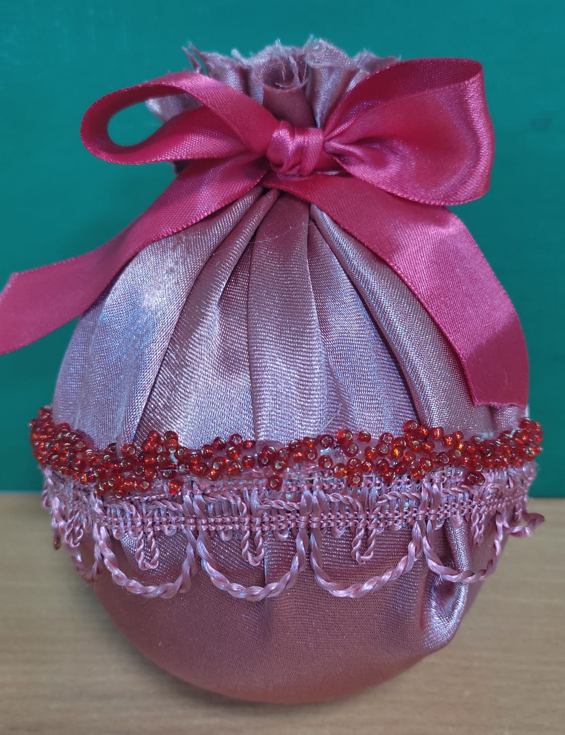 Описание: Шарик от сладости Чупа-Чупс, атласная лента, ткань и бусы.