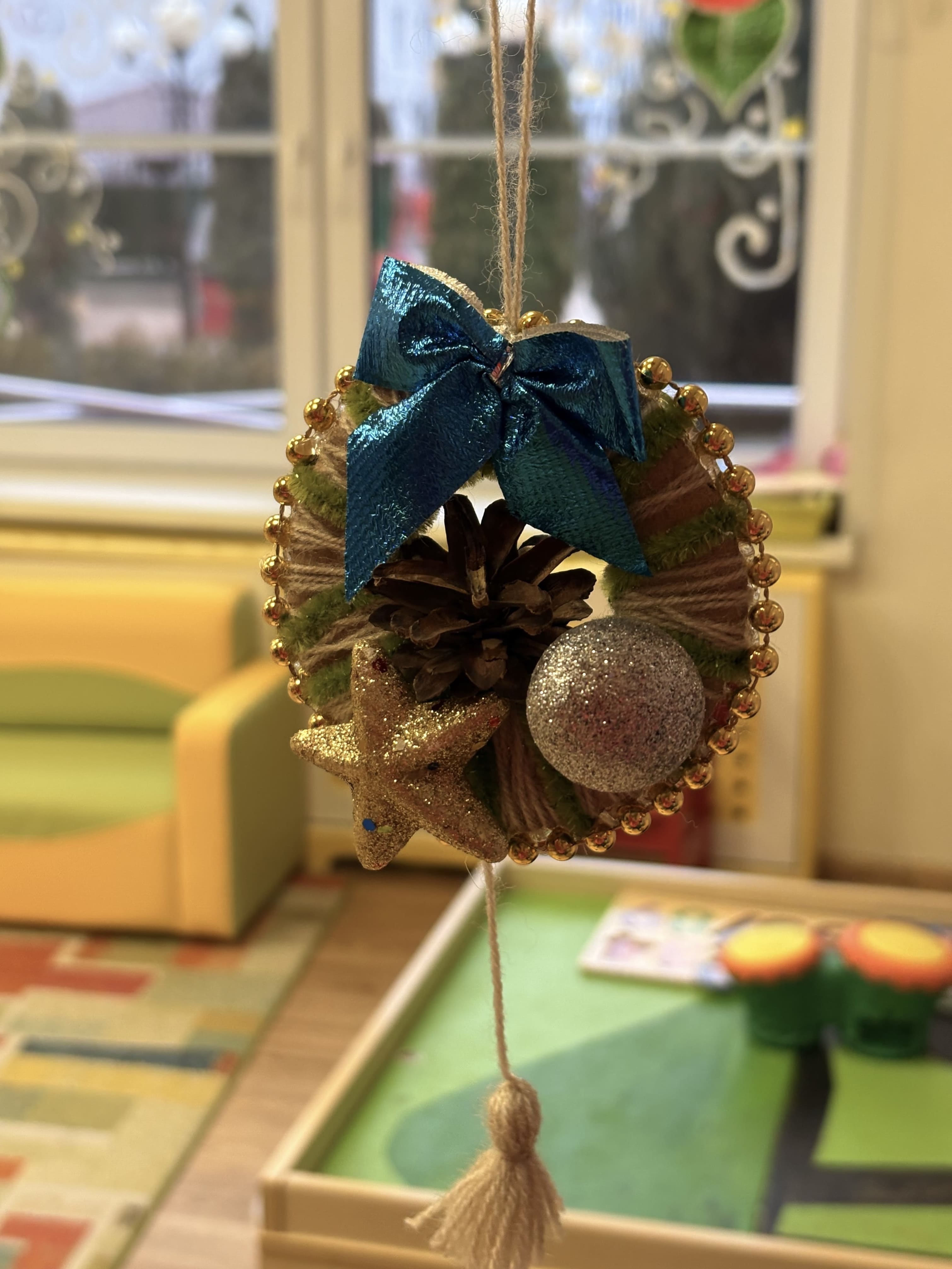 Описание: Елочная игрушка из картона, шишки и ниток.
