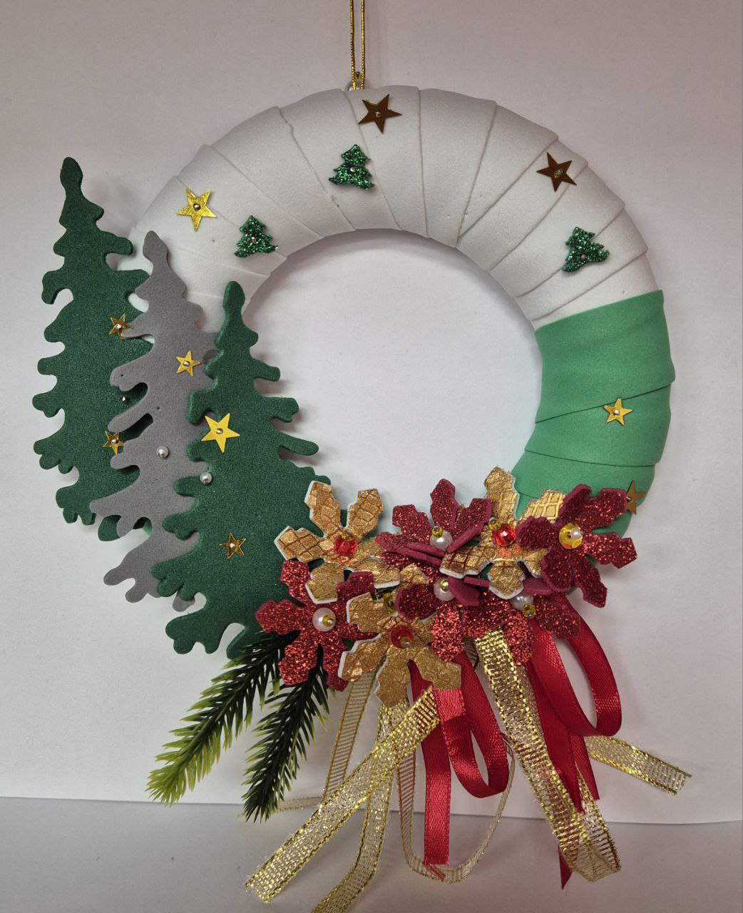 Описание: Венок из пенопласта, задекорирован фоамираном, украшен елочками и цветами из фоамирана, бусинами и атласными лентами. Крепится на ёлку за петельку. МБОУ СОШ №100
