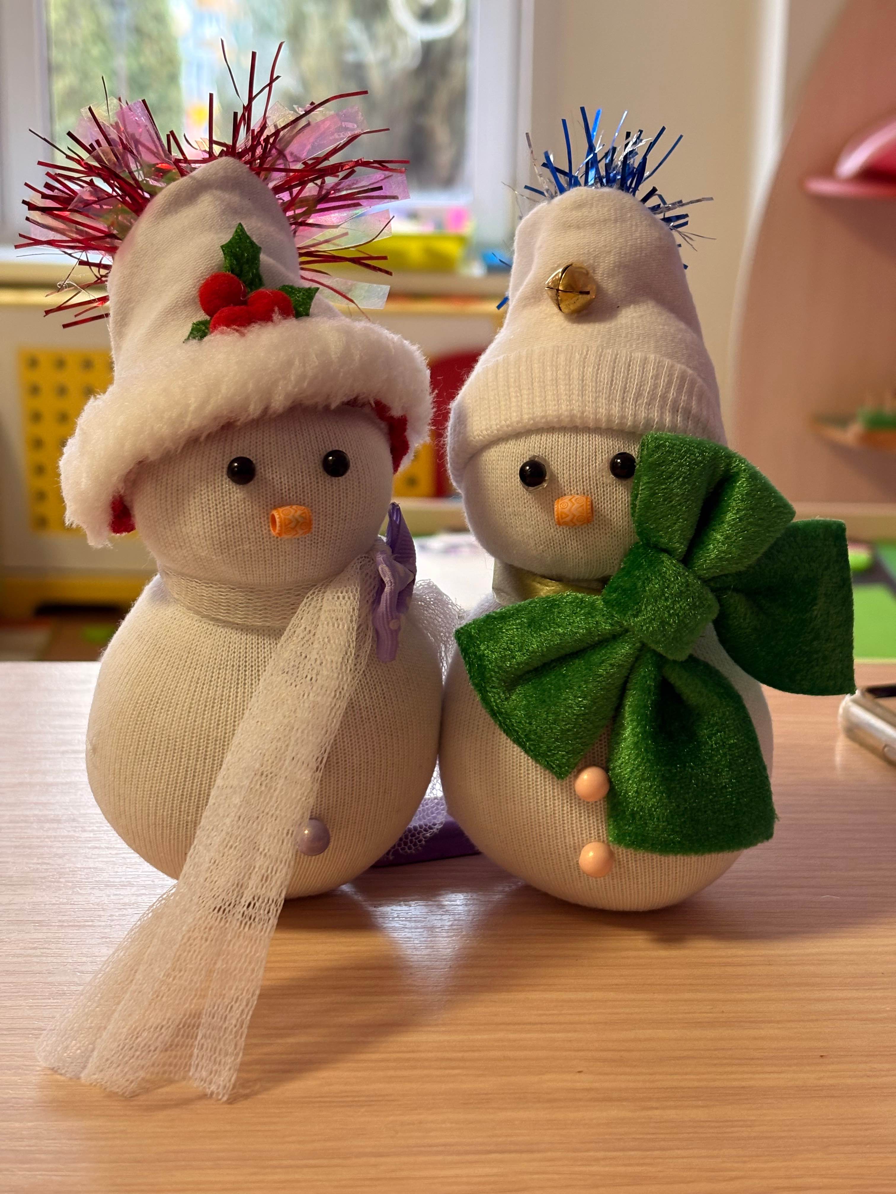 Описание: Дружные снеговики, выполненные из носков и ваты, украшенная бусинами, лентами и новогодней мишурой