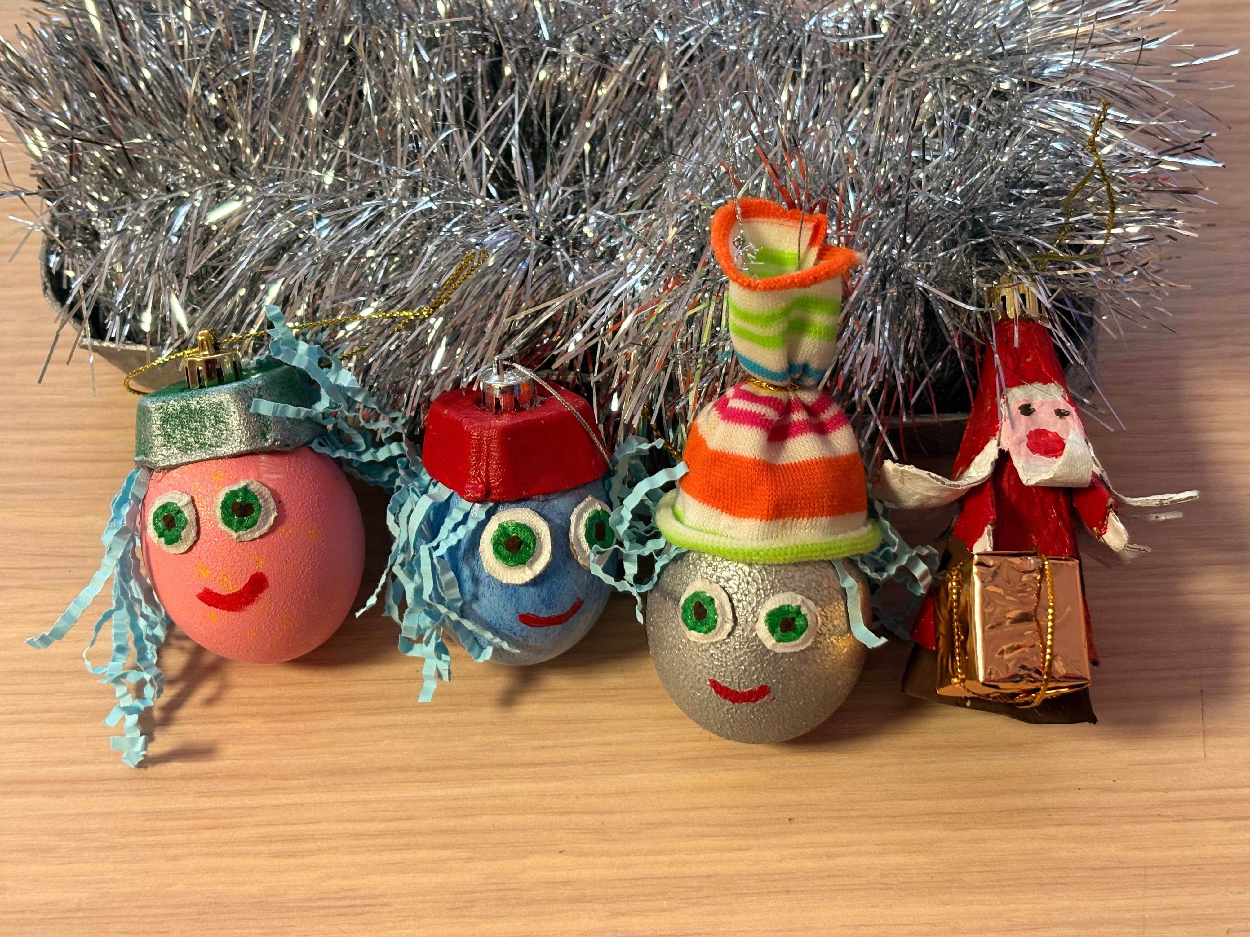 Описание: Елочные игрушки, выполненные из скорлупы яиц, с использованием декоративных элементов