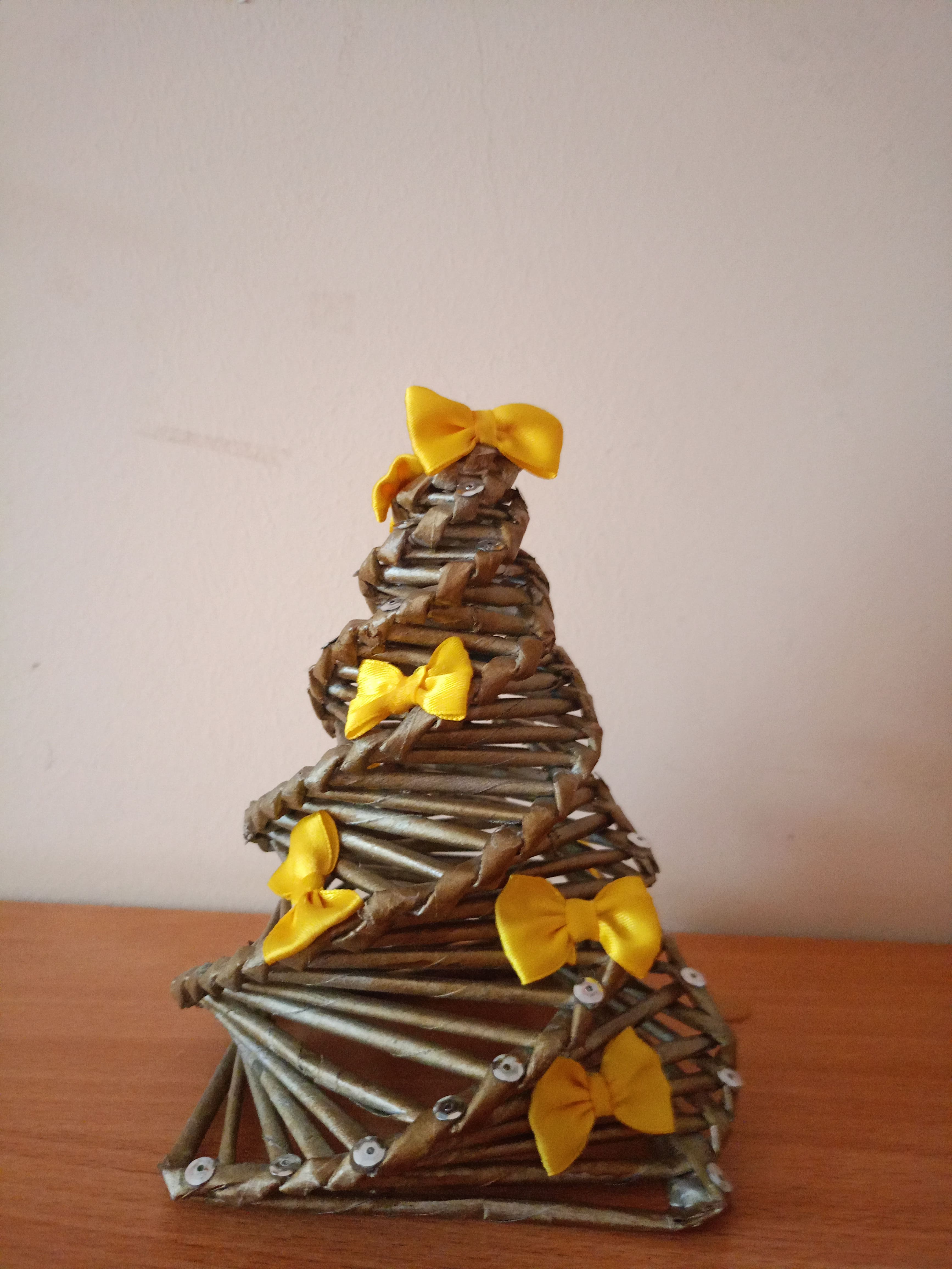 Описание: Необычная елка из бумажных трубочек — это креативная новогодняя поделка, созданная в технике «бумажная лоза», которая имитирует плетение из настоящей лозы, но использует скрученные в тонкие трубочки газетные или журнальные страницы.