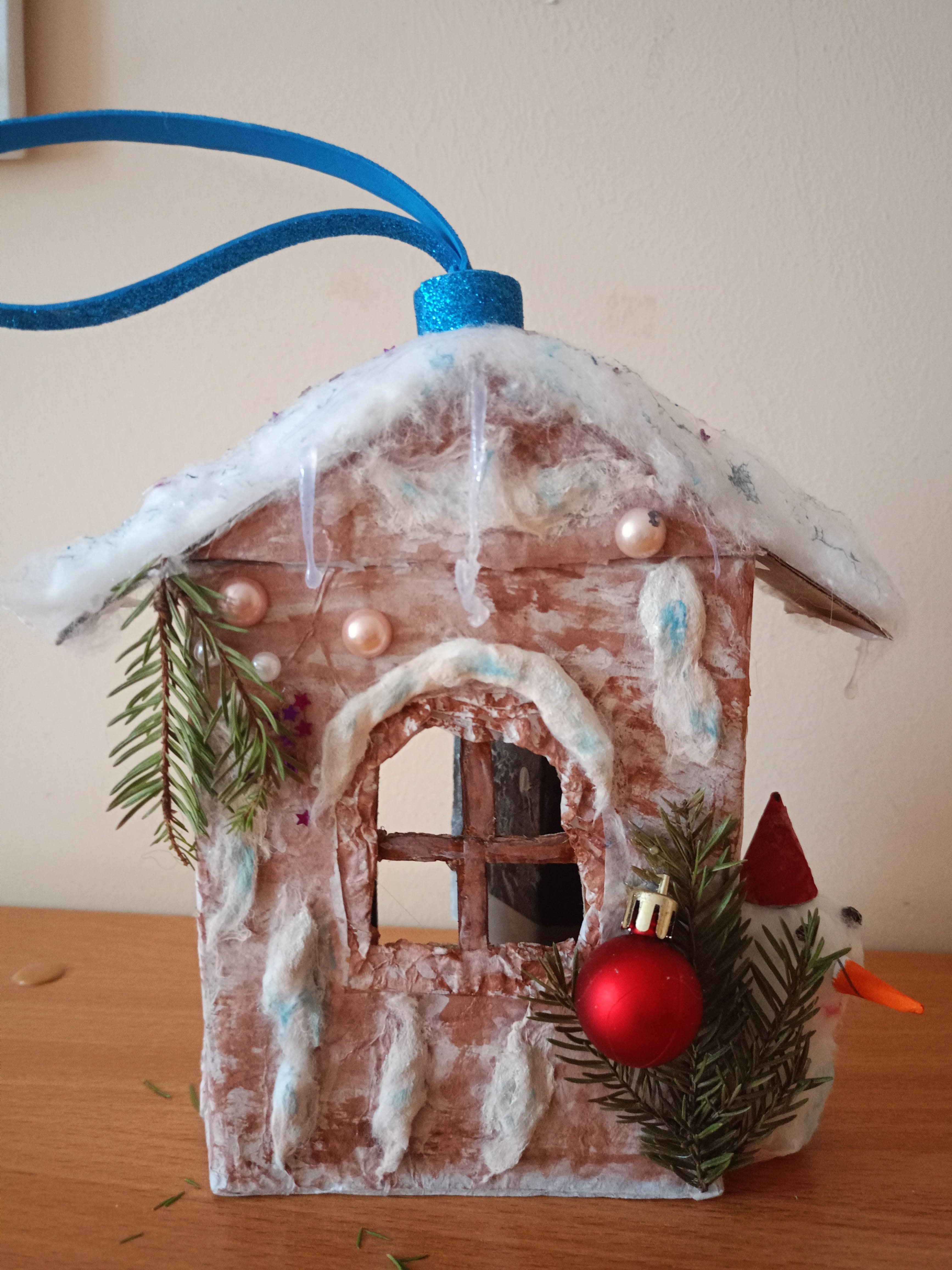 Описание: Поделка "Избушка Деда Мороза" из картона — это миниатюрный сказочный дом, сделанный своими руками из картонной коробки, украшенный в зимнем стиле.