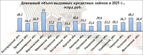 И все-таки нельзя не упомянуть и про субъекты с максимальным снижением объема выданных средств. Это Тульская (–21% или 10,4 млрд руб.), Калужская и Тверская (по –14% или 4,5 млрд руб.) и Ивановская (–14% или 2,6 млрд руб.) области. Помимо них еще в трех регионах двузначное снижение показателя предоставленных денежных средств – Смоленская, Рязанская и Костромская области.