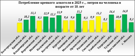 По объему потребления крепкого алкоголя лидирует Московская область. В прошлом году один совершеннолетний житель этого региона приобретал больше 15 литров крепких спиртных напитков. Также высокие показатели демонстрируют Ярославская и Тверская области.