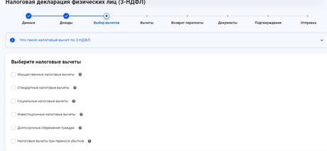 На главной странице в разделе "Доходы" или "Вычеты" нажимаем на вкладку "Декларации". Затем кликаем на ссылку "Подать декларацию" и выбираем способ – заполнение онлайн или загрузка готового документа. При онлайн-заполнении выбираем отчетный год, указываем действующий номер телефона. Затем в разделе "Доходы" обозначаем источник доходов. В пункте "Выбор вычетов" указываем интересующий вид налогового вычета и заполняем пустующие графы.